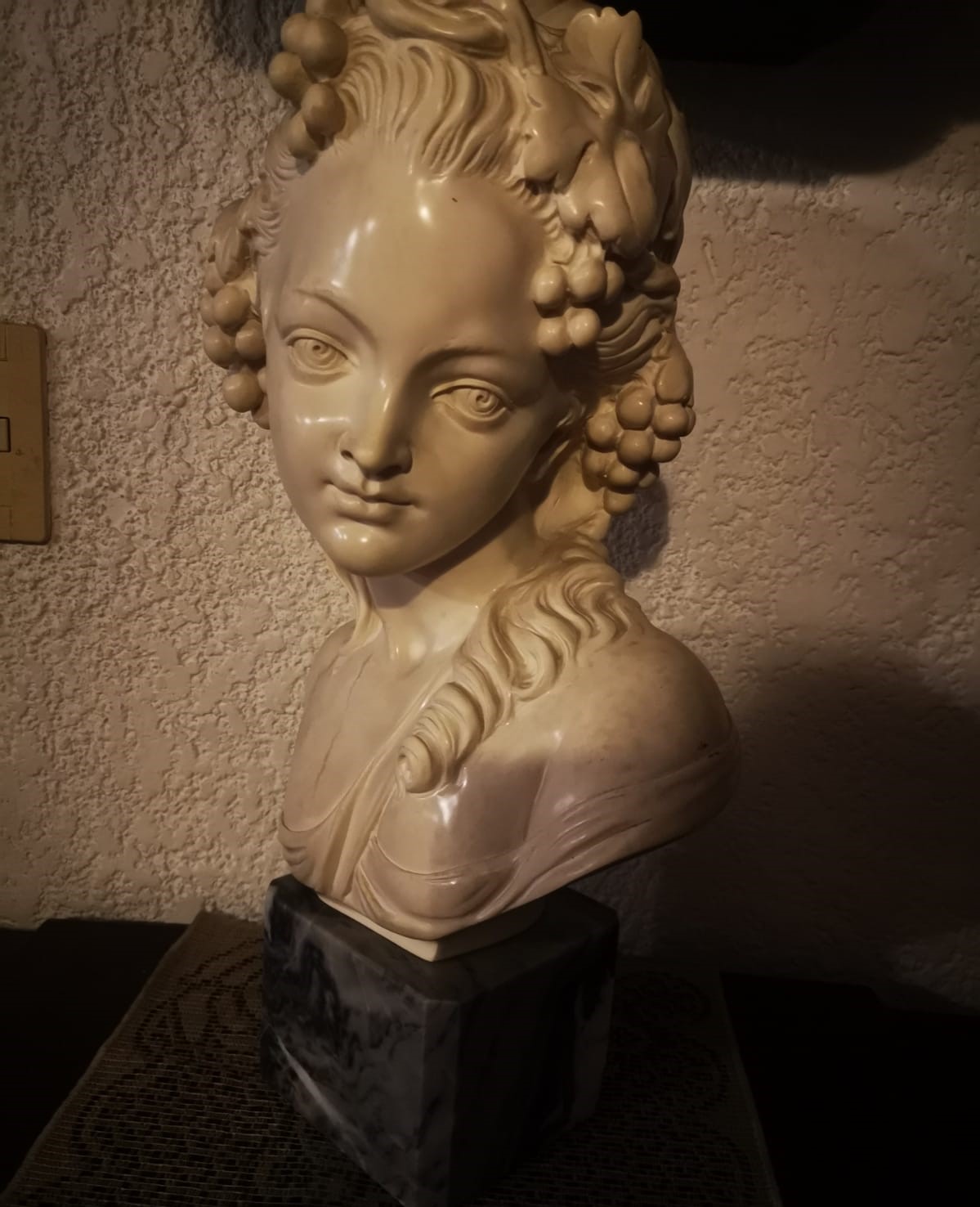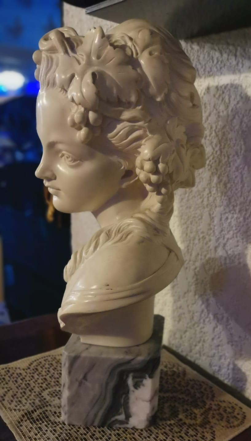Busto antiguo en alabastro de mujer joven con base de marmol.
